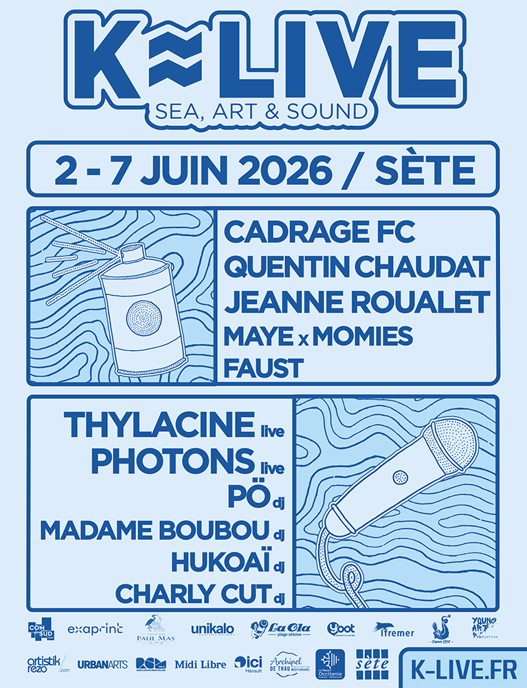 Au programme de cette année, trois nouvelles fresques signées Jeanne Roualet, Quentin Chaudat et le duo Cadrage FC sur la façade du stade Louis Michel. Fidèle à son ADN, le K- Live mêlera performances d’Art Urbain, musiques (nombreux concerts et DJ Set) et événement (Beach Party, pique-nique et clubbing), pour rappeler que « festival » et « fêtes » ont la même étymologie, sans oublier le K-Live Exquis – version urbaine du cadavre exquis – avec les artistes Maye et Momies sur un DJ set de Cherly Cut !