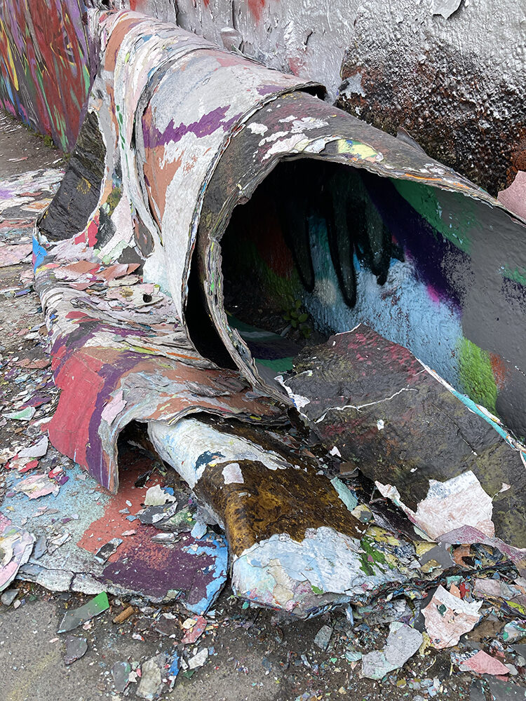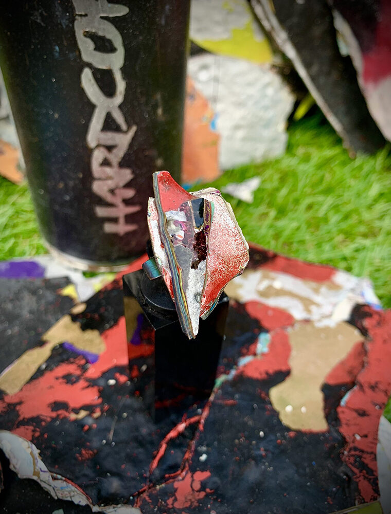 Como nasci em uma galeria, sempre tive uma sensibilidade pela arte. De forma bastante natural, me interessei pela arte de rua, algo mais presente na minha geração. O grafiteiro pintando como um vândalo nas vias férreas à noite era, para mim, quase um sonho. Quando cheguei a Paris, tive a sorte de conhecer os membros da galera RSK, que eu costumava acompanhar na Petite Ceinture e ao longo do Canal de l’Ourcq. Com eles, descobri a história e o universo da arte de rua. Até fiz duas ou três pintadas [risos]. As cascas de grafite que eles jogavam no canal – pedaços inteiros de parede de 1 ou até 2 m² cheios de intensidade – me pareceram um material arqueológico: cada camada era, pra mim, um momento preso no concreto com uma cor, uma temporalidade, uma história… Minha primeira intuição foi escavar esses fragmentos para revelar as camadas, emoldurar esses pedaços e oferecê-los aos amigos. Quando fui morar em Berlim, me instalei perto do Mauerpark [antiga terra de ninguém criada em uma zona tampão do antigo Muro de Berlim, NDLR], hoje adornado com um pedaço de muro dedicado aos grafites, onde encontrei camadas com mais de 20 cm, hipercoloridas, hiperdensas… que recolhi freneticamente. Um dia, uma dessas peças rachou ao meio. Olhando para elas, imaginei-as como acessórios e as transformei em brincos! Como muitas pessoas me paravam na rua para perguntar onde eu as tinha comprado, comecei a atender pedidos. Depois, tudo aconteceu muito rápido: estar em Berlim me deu um certo alcance internacional, graças aos muitos turistas que levavam minhas peças para os quatro cantos do mundo.