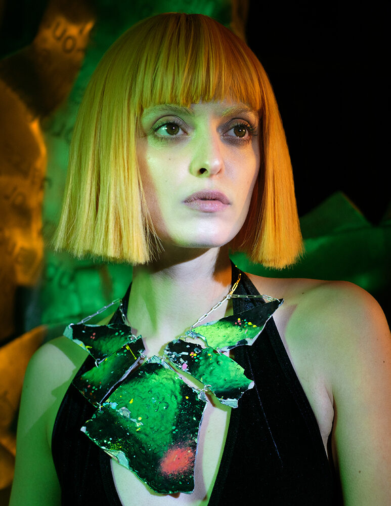 Me aperfeiçoando, fazendo testes e evitando produtos químicos, moldando cada fragmento à mão. Foi assim que descobri a resina epóxi, que aplico com pincel. São necessárias de 4 a 5 camadas de epóxi por lado, com 48 horas de secagem entre cada camada. Também aprendi muito com a Marion Fillancq [escultora de joias, NDLR], que me abriu as portas do seu ateliê, onde me formei em alta joalheria.